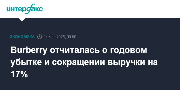 Москва. 14 мая. INTERFAX.RU - Британская Burberry Group Plc, один из ведущих мировых производителей товаров класса "люкс", получила чистый убыток в 2025 финансовом году и сократила годовую выручку на 17%.