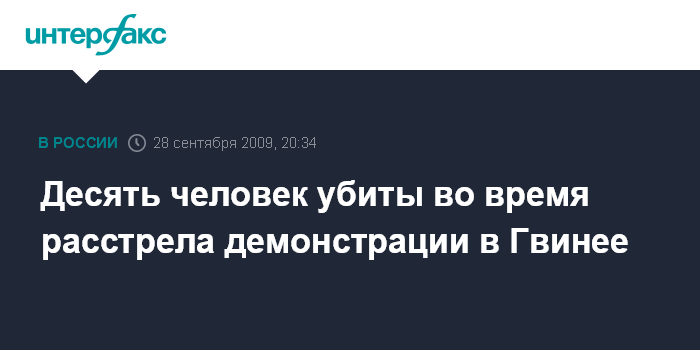 Лондон. 28 сентября. ИНТЕРФАКС - Не менее 10 человек погибли во время разгона манифестации протеста в столице Гвинеи городе Конакри, сообщает BBC.