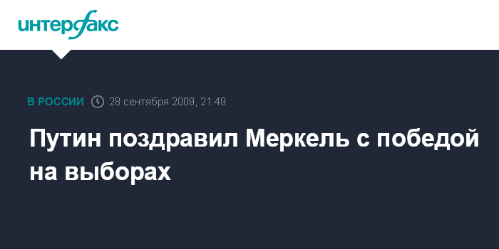 Москва. 28 сентября. INTERFAX.RU - Премьер-министр РФ Владимир Путин в телефонном разговоре с Федеральным канцлером ФРГ Ангелой Меркель поздравил ее "с убедительной победой на состоявшихся накануне парламентских выборах", сообщает пресс-служба правительства РФ в понедельник.