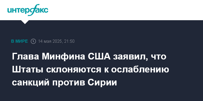 Москва. 14 мая. INTERFAX.RU - Вашингтон намерен ослаблять санкции против Дамаска, сообщил в среду министр финансов США Скотт Бессент.