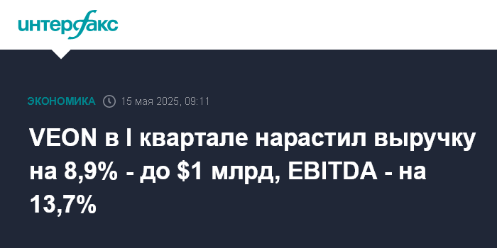 Москва. 15 мая. INTERFAX.RU - Телекоммуникационный холдинг VEON в I квартале 2025 года получил выручку в размере $1,03 млрд, что на 8,9% больше, чем годом ранее, сообщила компания.