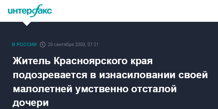 Красноярск. 29 сентября. ИНТЕРФАКС-СИБИРЬ - Красноярская краевая прокуратура завершила расследование уголовного дела по обвинению 26-летнего жителя Краснотуранского района в изнасиловании своей малолетней дочери.