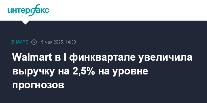 Москва. 15 мая. INTERFAX.RU - Американская Walmart Inc., крупнейшая в стране компания розничной торговли, увеличила выручку на 2,5% в первом финансовом квартале и сократила чистую прибыль на 12%, а также подтвердила прогнозы на текущий фингод.