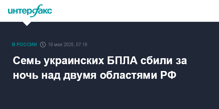 Москва. 18 мая. INTERFAX.RU - В ночь на воскресенье российские военные уничтожили семь украинских беспилотников над Белгородской и Брянской областями, сообщило Минобороны РФ.