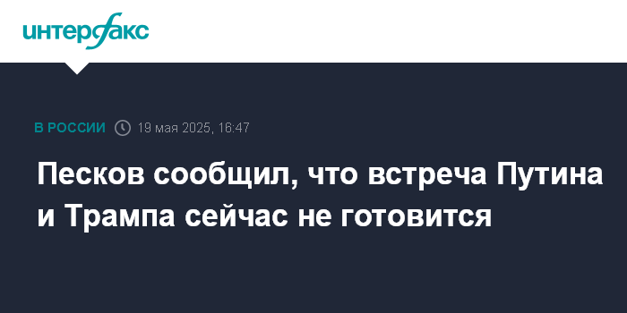 Москва. 19 мая. INTERFAX.RU - Встреча президентов РФ и США Владимира Путина и Дональда Трампа в настоящее время не готовится, заявил пресс-секретарь главы российского государства Дмитрий Песков.