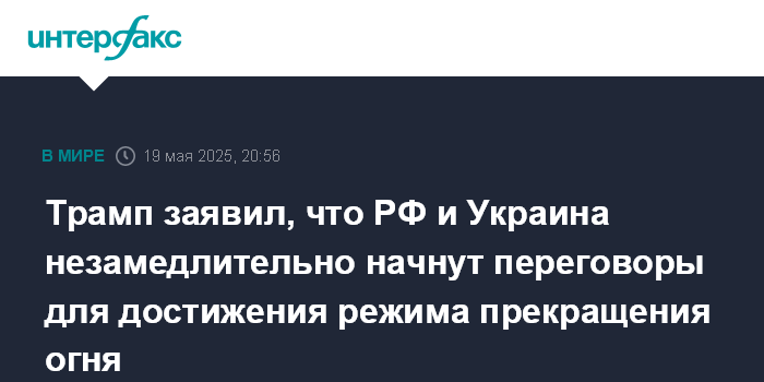 Трамп заявил, что РФ и Украина незамедлительно начнут переговоры для достижения режима прекращения огня
