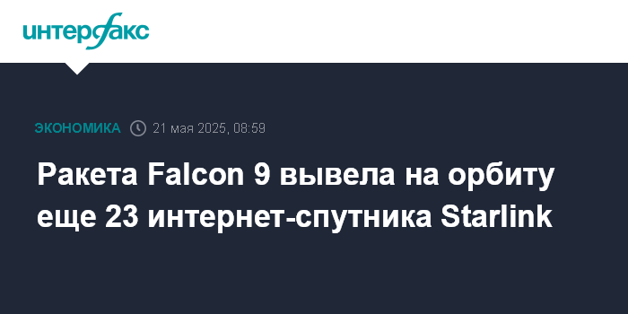 Москва. 21 мая. INTERFAX.RU - Ракета-носитель Falcon 9 в среду по московскому времени успешно вывела на орбиту партию из 23 мини-спутников для пополнения орбитальной группировки глобальной сети интернет-покрытия системы Starlink, сообщила компания-разработчик SpaceX.