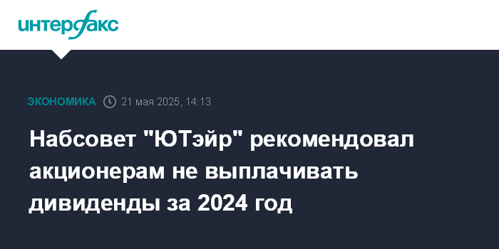 Москва. 21 мая. INTERFAX.RU - Наблюдательный совет ПАО "Авиакомпания "ЮТэйр" рекомендовал акционерам на годовом собрании 24 июня принять решение не выплачивать дивиденды по результатам 2024 года, сообщил перевозчик.
