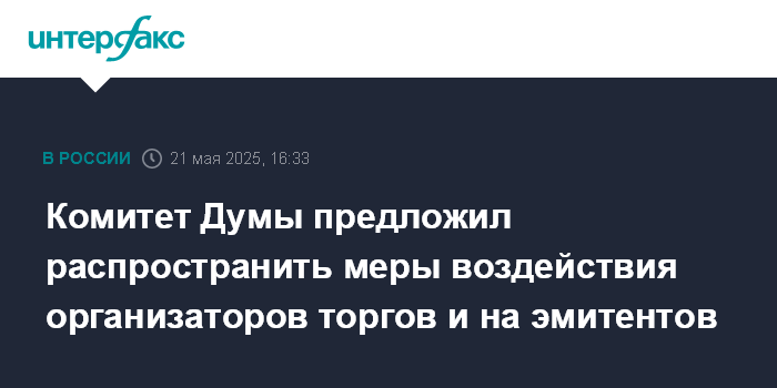 Москва. 21 мая. INTERFAX.RU - Комитет Госдумы по финансовому рынку предложил при доработке законопроекта о расширении полномочий организаторов торгов предусмотреть возможность применения мер воздействия не только к участникам торгов, но и к эмитентам.