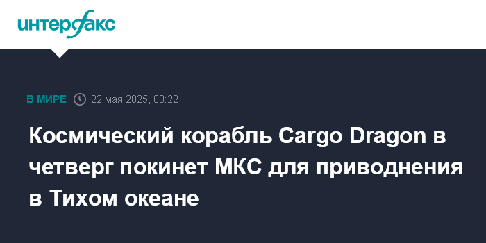 Москва. 22 мая. INTERFAX.RU - Многоразовый грузовой космический корабль Cargo Dragon компании SpaceX в четверг расстыкуется с Международной космической станцией (МКС) для последующего приводнения в Тихом океане у берегов Калифорнии, сообщает NASA.