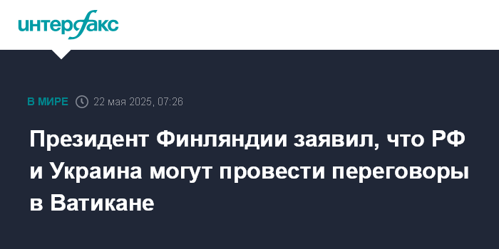 Москва. 22 мая. INTERFAX.RU - Переговоры на техническом уровне между делегациями России и Украины могут состояться на следующей неделе в Ватикане, заявил президент Финляндии Александер Стубб.