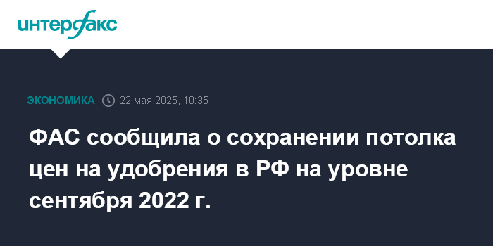 Москва. 22 мая. INTERFAX.RU - Федеральная антимонопольная служба (ФАС) РФ согласовала торговые политики производителей минудобрений на период с июня по ноябрь 2025 года, сообщило ведомство.