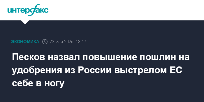 Москва. 22 мая. INTERFAX.RU - Пресс-секретарь президента РФ Дмитрий Песков сравнил с выстрелом себе в ногу решение Евросоюза повысить пошлины на российские удобрения.