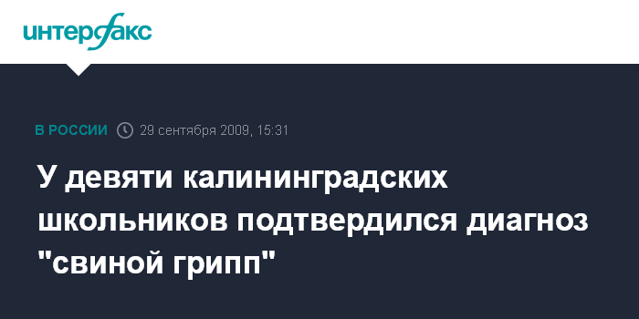 Москва. 29 сентября. INTERFAX.RU - Массовое заболевание учеников средней школы N30 города Калининград официально квалифицировано как грипп А/H1N1, сообщили "Интерфаксу" в управлении Роспотребнадзора по Калининградской области. "Официальное заключение о диагнозе заболевания вынесено специалистами ведомственного института из Санкт-Петербурга, куда были направлены анализы калининградских школьников. Лаборатория в Калининграде лишь предполагала "свиной" грипп у девяти учеников 5Б класса средней школы N30", - заявил представитель управления. По его словам, с учетом ранее выявленных официальных случаев регистрации заболевания "свиным гриппом" таких больных в области с момента распространения А/H1N1 уже насчитывается 19 человек.