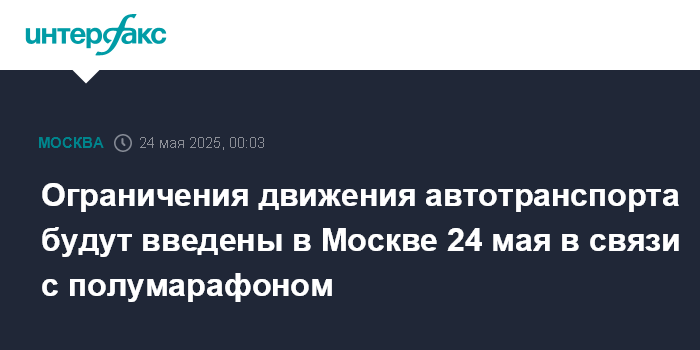 Москва. 24 мая. INTERFAX.RU - Движение для транспорта будет временно ограничено в Москве на ряде центральных набережных и улиц, а также на участке Садового кольца в связи с проведением полумарафона "Забег.РФ" в субботу, 24 мая, сообщили в столичном департаменте транспорта.