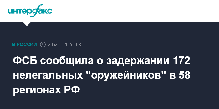 Москва. 26 мая. INTERFAX.RU - В ФСБ сообщили о задержании 172 человек, причастных к незаконному обороту оружия в 58 субъектах РФ, прекращена работа 62 подпольных мастерских по переделке оружия.