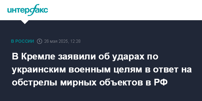 Москва. 26 мая. INTERFAX.RU - Россия наносит массированные удары по украинским военным целям в ответ на обстрелы Киевом мирных объектов на российской территории, заявил на брифинге пресс-секретарь президента РФ Дмитрий Песков.