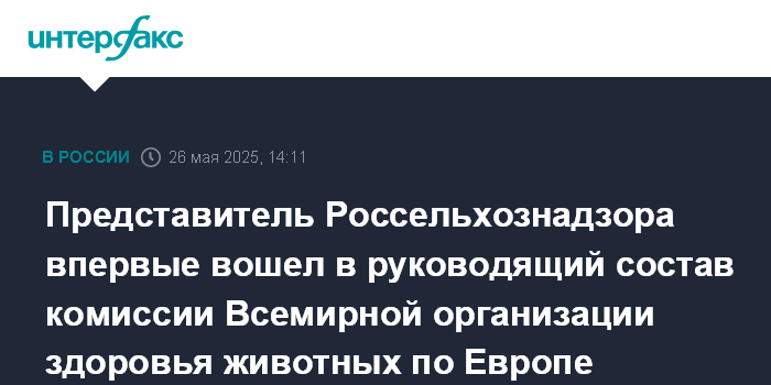 Москва. 26 мая. INTERFAX.RU - Представитель Россельхознадзора впервые избран в руководящий состав комиссии Всемирной организации здоровья животных (ВОЗЖ) по Европе.