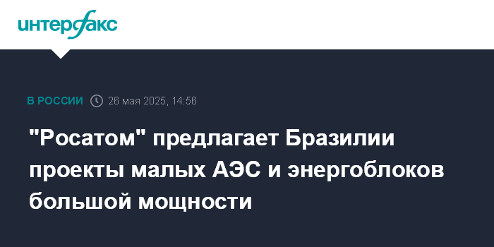 "Подчеркивая значимость атомных проектов для ответа на климатические вызовы и для развития территорий, мы готовы расширять взаимодействие и предлагаем Бразилии проекты как атомных электростанций малой мощности (АСММ), так и энергоблоков большой мощности для укрепления энергосистемы страны", - приводятся слова Дымова в сообщении.