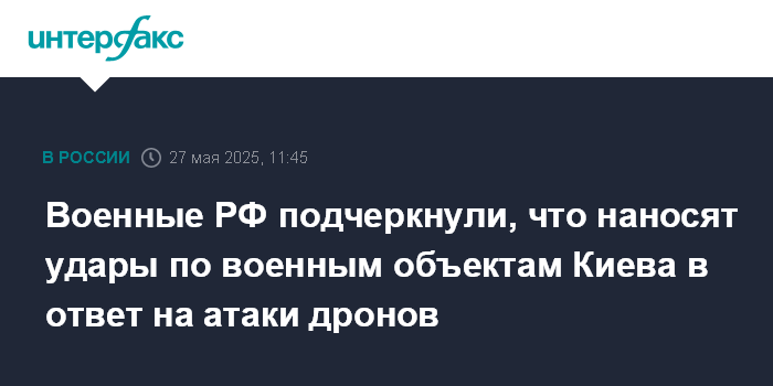 Москва. 27 мая. INTERFAX.RU - Российские военные в ответ на массированные украинские атаки беспилотниками наносят удары исключительно по военным объектам и предприятиям ВПК Украины, заявили в Минобороны РФ во вторник.