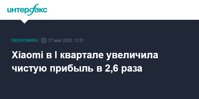 Москва. 27 мая. INTERFAX.RU - Китайский производитель потребительской электроники Xiaomi в первом квартале 2025 года увеличил чистую прибыль в 2,6 раза и нарастил выручку на 47,4%, его скорректированная прибыль и выручка превзошли прогнозы рынка.