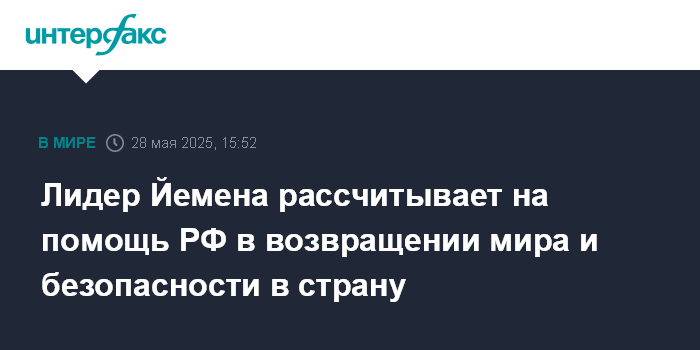 Москва. 28 мая. INTERFAX.RU - Руководство Йемена выступает за развитие сотрудничества с Россией и рассчитывает на ее помощь в возвращении мира и безопасности в эту страну, заявил председатель руководящего президентского совета Йемена Рашад Мухаммед аль-Алими.