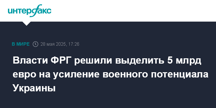 Москва. 28 мая. INTERFAX.RU - Власти ФРГ приняли решение направить 5 млрд евро на усиление оборонного потенциала Украины, говорится в обнародованном в среду заявлении Минобороны Германии.