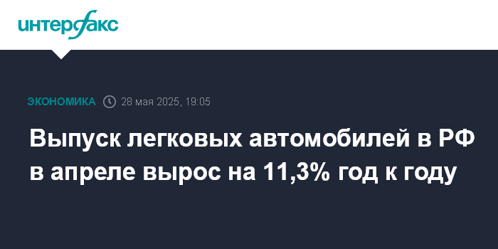 Москва. 28 мая. INTERFAX.RU - Производство легковых автомобилей в РФ в апреле 2025 года выросло на 11,3% в сравнении с тем же месяцем прошлого года, грузовых - сократился на 22,4%, сообщил Росстат.