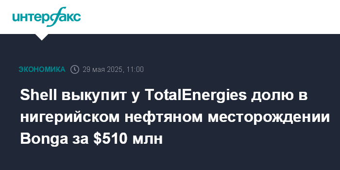 Москва. 29 мая. INTERFAX.RU - Британо-нидерландский нефтегазовый гигант Shell купит долю французской TotalEnergies в нефтяном месторождении Bonga у берегов Нигерии за $510 млн, говорится в сообщении Shell.