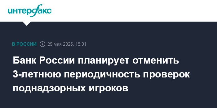 Москва. 29 мая. INTERFAX.RU - Банк России планирует отменить трехлетнюю периодичность проверок поднадзорных организаций, говорится в сообщении регулятора.