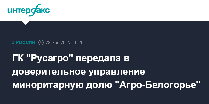 "Доля предприятия "Агро-Белогорье" передана в доверительное управление АО "Корпорация развития", которое принадлежит Белгородской области", - подтвердил затем губернатор региона Вячеслав Гладков. Он уточнил, что 18 мая встречался с гендиректором ГК "Русагро" Тимуром Липатовым и топ-менеджментом компании 28 мая.