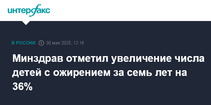 Москва. 30 мая. INTERFAX.RU - Показатель общей заболеваемости ожирением среди детей в возрасте до 14 лет в период с 2018 года увеличился более чем на 36%, говорится в презентации главы Минздрава России Михаила Мурашко. Он представил ее в Национальном медицинском исследовательском центре (НМИЦ) детской гематологии, онкологии и иммунологии им. Рогачева.