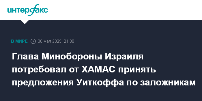 Москва. 30 мая. INTERFAX.RU - Министр обороны Израиля Исраэль Кац в пятницу заявил, что движение ХАМАС либо примет предложения спецпосланника президента США Стива Уиткоффа по заложникам и перемирию в Газе, либо подвергнется уничтожению.