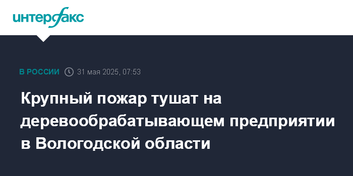 Крупный пожар тушат на деревообрабатывающем предприятии в Вологодской области