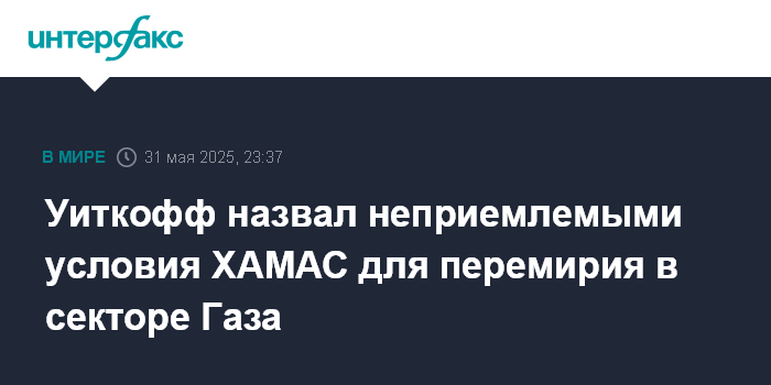 Москва. 31 мая. INTERFAX.RU - Сформулированные палестинским движением ХАМАС условия для 60-дневного перемирия с Израилем в секторе Газа - неприемлемые, заявил в субботу вечером спецпосланник президента США по Ближнему Востоку Стив Уиткофф.