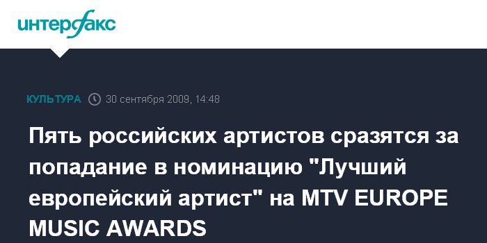 Москва. 30 сентября. INTERFAX.RU - На сайте www.ema.mtv.ru открылось голосование за лучшего российского исполнителя MTV EMA 2009. Каждая из 23 стран-участниц представила пятерых номинантов в свою региональную номинацию. От России по итогам зрительского голосования в эту номинацию попали: группа Centr, Дима Билан, группа "Каста", Сергей Лазарев и Тимати.