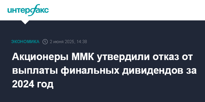 Москва. 2 июня. INTERFAX.RU - Акционеры "Магнитогорского металлургического комбината" на годовом собрании, которое состоялось 30 мая, утвердили решение не выплачивать финальные дивиденды за 2024 год, сообщила компания.