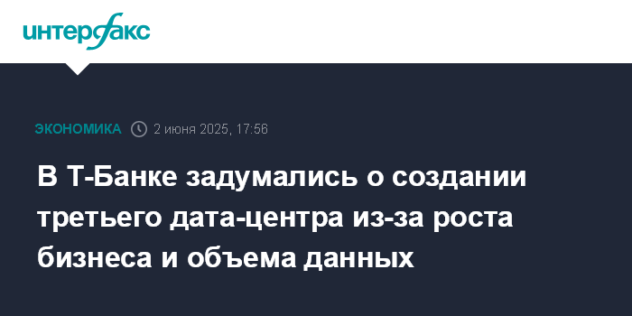 Москва. 2 июня. INTERFAX.RU - Т-Банк (входит в "Т-Технологии") думает о создании еще одного дата-центра из-за роста бизнеса и объема данных, сообщил "Интерфаксу" зампред правление банка Вячеслав Цыганов в кулуарах ЦИПР-2025.