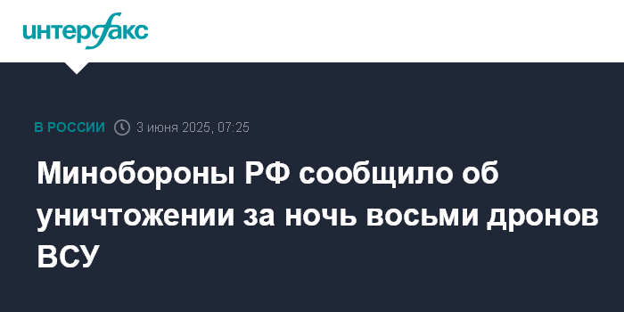 "В период с 20.00 2 июня до 7.00 по Москве 3 июня дежурными средствами ПВО уничтожены восемь украинских беспилотных летательных аппаратов самолетного типа", - сказано в сообщении министерства.