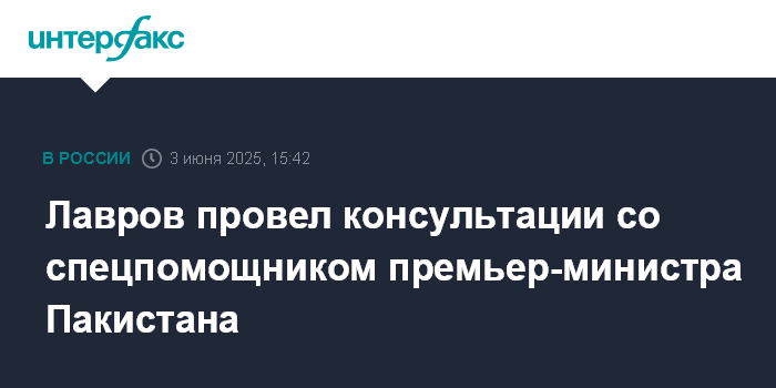 Москва. 3 июня. INTERFAX.RU - Министр иностранных дел России Сергей Лавров в Москве провел консультации со специальным помощником премьер-министра Пакистана Тареком Фатими, сообщает сайт МИДа.