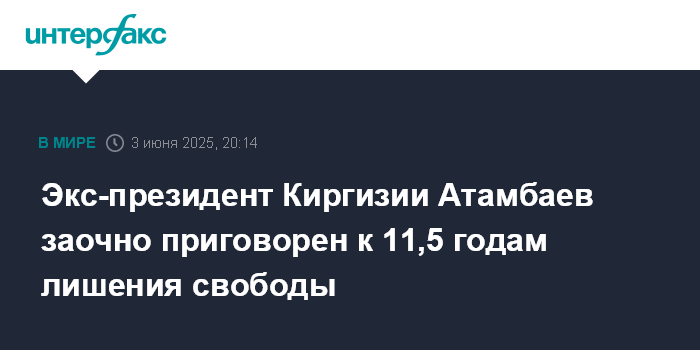 Москва. 3 июня. INTERFAX.RU - Первомайский районный суд Бишкека приговорил заочно бывшего президента страны Алмазбека Атамбаева к 11 годам и шести месяцам лишения свободы по делу о кой-ташских событиях, когда попытка задержания Атамбаева переросла в столкновения спецназа со сторонниками бывшего главы государства.