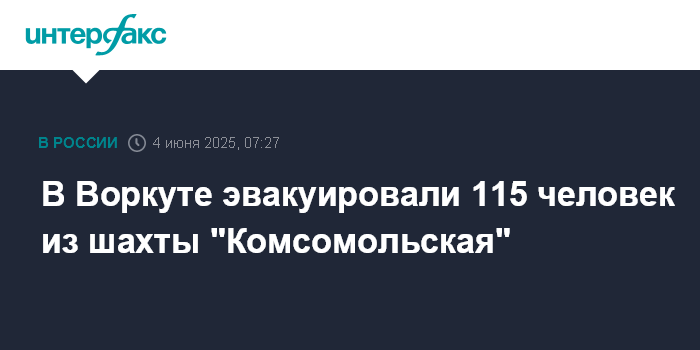 Москва. 4 июня. INTERFAX.RU - В связи с остановкой вентилятора главного проветривания из шахты "Комсомольская" МО "Воркута" было эвакуировано 115 человек, сообщило ГУ МЧС России по Республике Коми.