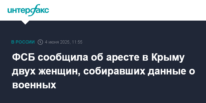 Москва. 4 июня. INTERFAX.RU - ФСБ РФ сообщила о задержании и аресте в Крыму двух женщин, которые по заданию украинских спецслужб собирали информацию о военных объектах и военнослужащих Черноморского флота.