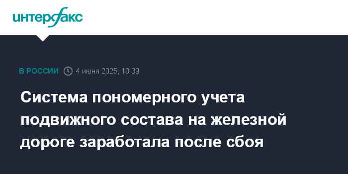 Москва. 4 июня. INTERFAX.RU - Работа информационной системы пономерного учета железнодорожного подвижного состава возобновлена после сбоя, сообщает Федеральное агентство железнодорожного транспорта (Росжелдор).