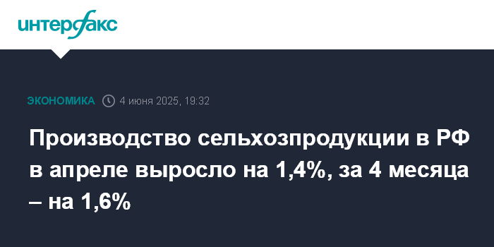 Производство сельхозпродукции в РФ в апреле выросло на 1,4%, за 4 месяца – на 1,6%