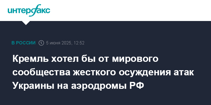 Москва. 5 июня. INTERFAX.RU - В Кремле предпочли бы услышать от международного сообщества жесткое осуждение украинских атак на российские аэродромы 1 июня, заявил пресс-секретарь президента РФ Дмитрий Песков.