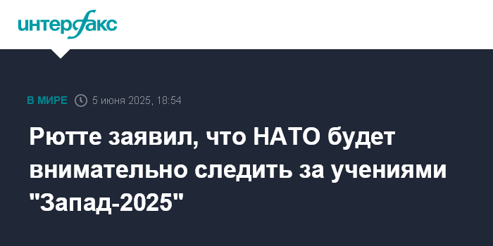 Москва. 5 июня. INTERFAX.RU - В НАТО следят за военной активностью РФ и готовы наблюдать за запланированными на сентябрь в Белоруссии учениями "Запад-2025", заявил в четверг генсек альянса Марк Рютте.