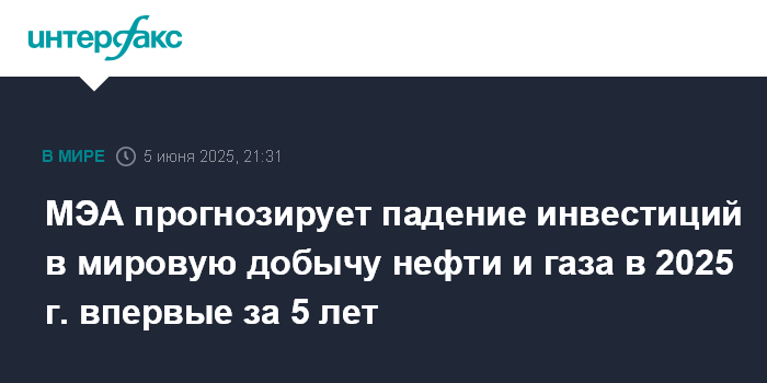 МЭА прогнозирует падение инвестиций в мировую добычу нефти и газа в 2025 г. впервые за 5 лет