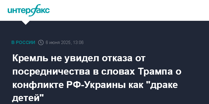 Москва. 6 июня. INTERFAX.RU - Пресс-секретарь президента РФ Дмитрий Песков не считает, что последнее заявление президента США Дональда Трампа, сравнившего российско-украинский конфликт с "дракой детей", свидетельствует о нежелании Вашингтона продолжить свою посредническую миссию.