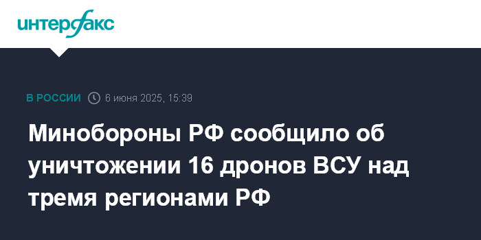 Москва. 6 июня. INTERFAX.RU - Российские военные днем сбили 16 украинских беспилотников над Курской, Белгородской и Брянской областями, заявили в Минобороны РФ в пятницу.